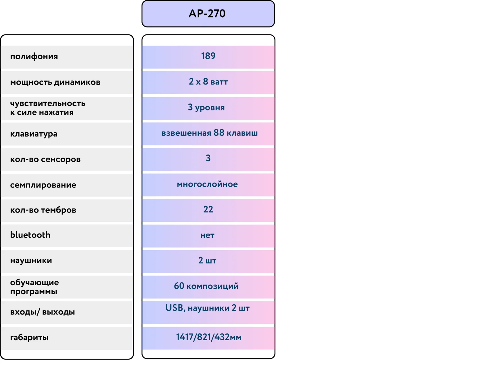 AP-270 это цифровое пианино с самой низкой ценой в линейке Celviano. Кстати если вам попадется попадется модель AP-265 то имейте ввиду что это одинаковые инструменты. Сейчас много завозят по параллельному импорту, а у Casio для разных стран свои “коды" для некоторых моделей. Зачем они это делают хз, но факт остаётся фактом. Различий между ними нету.