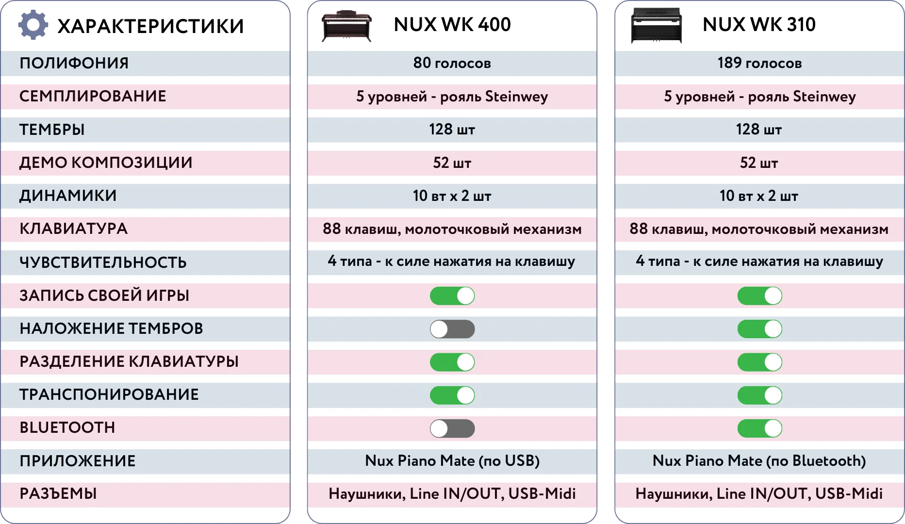Модели WK-310/400 самые продаваемые корпусные пианино бренда NUX. Однако все инструменты имеют свои сильные и слабые стороны, о них и пойдет речь в этой статье.