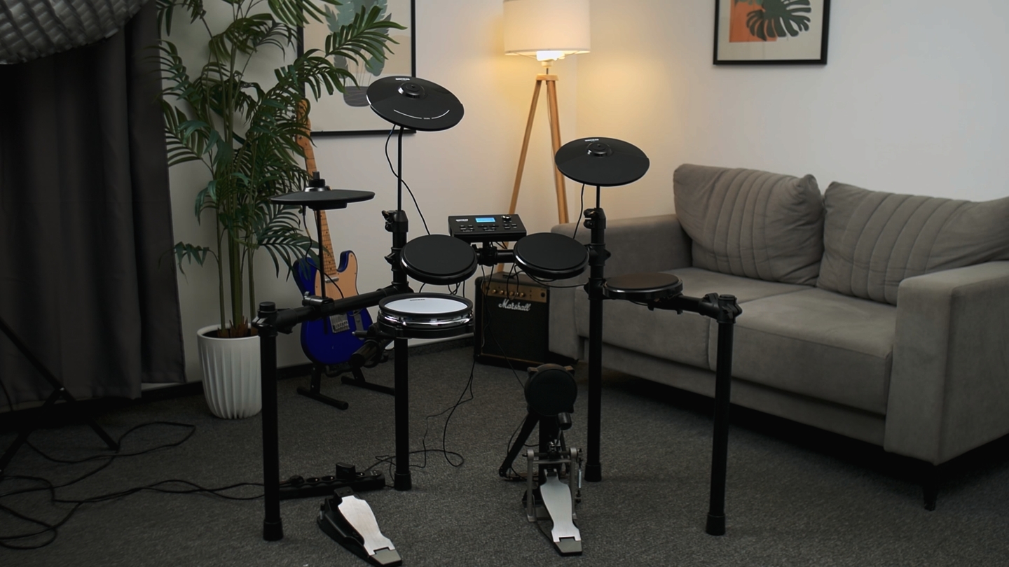 - · Комплектация: рама, пэды, тарелки, кик-пэд, педаль, педаль хай-хэта, модуль, кабели и коммутация, блок питания, инструкция, палки, USB-MIDI кабель, липучки