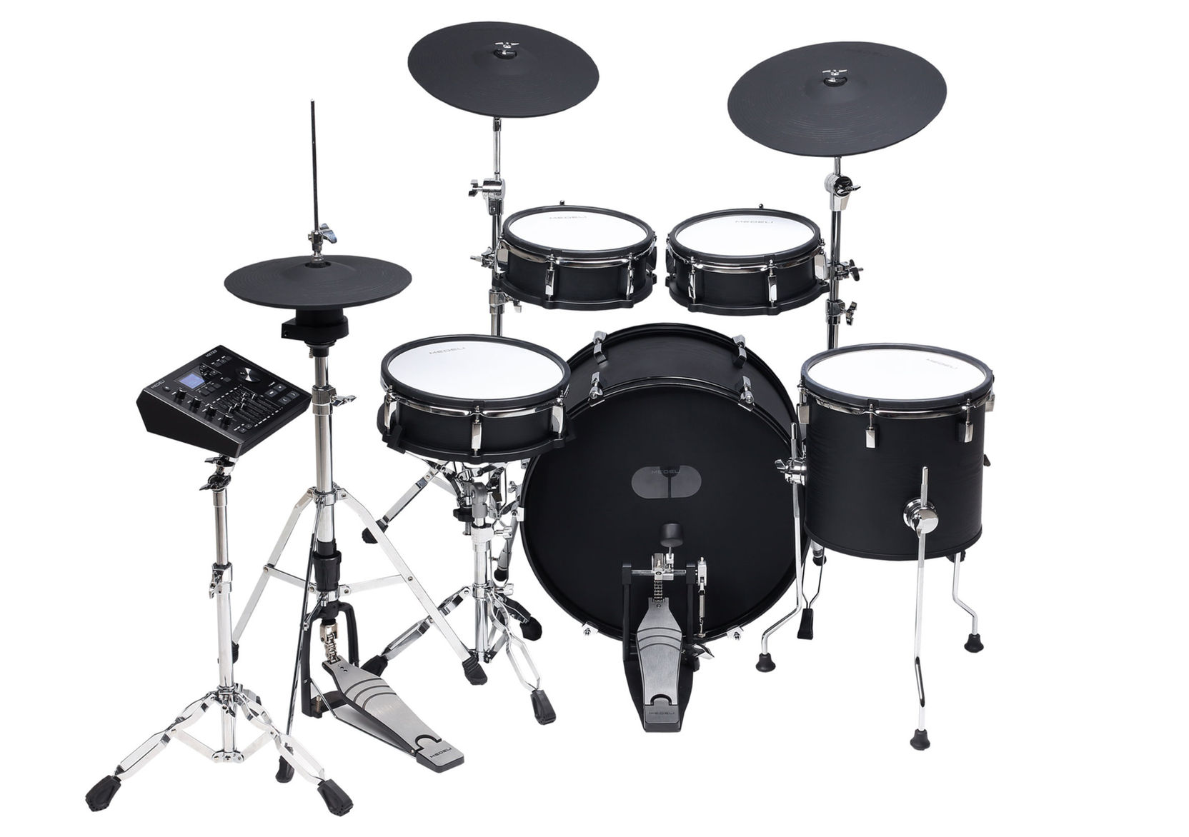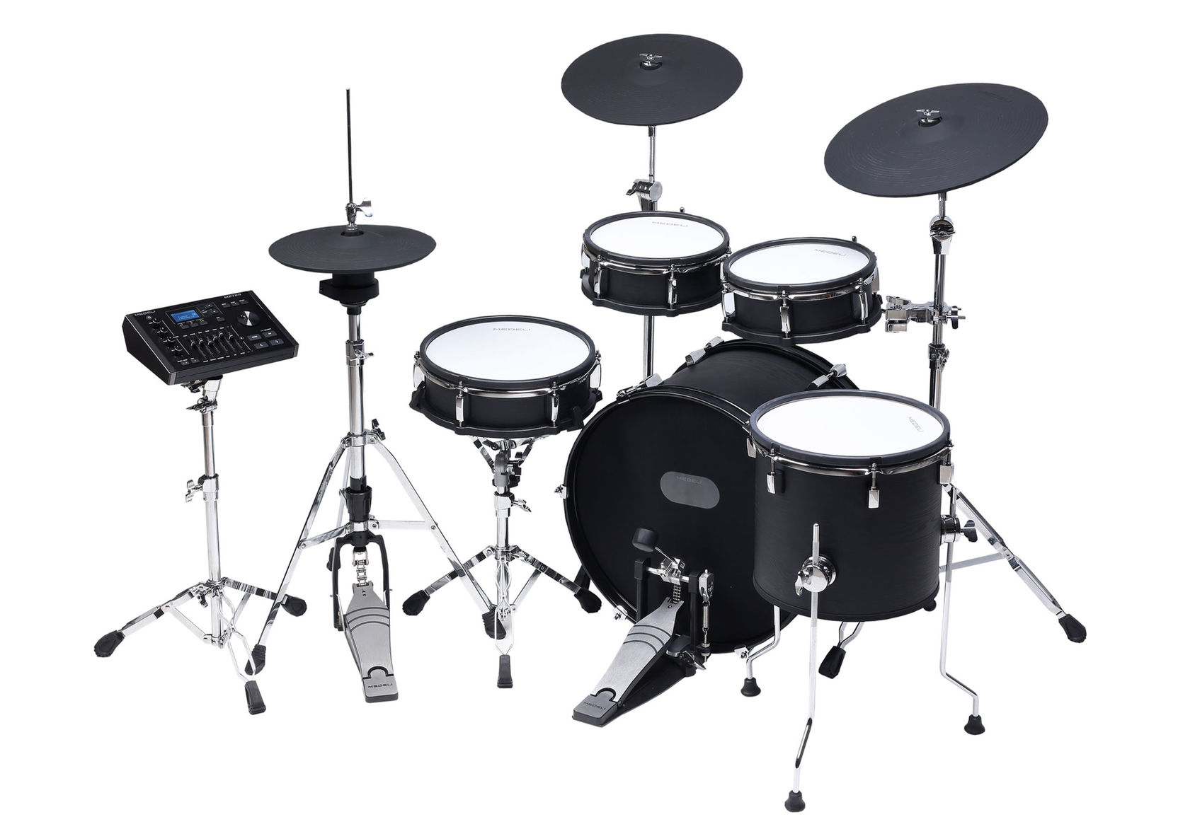 - · Комплектация: пэды, тарелки, педаль бас-барабана, стойка и контроллер хай-хэта, модуль, стойки, коммутация, блок питания, инструкция