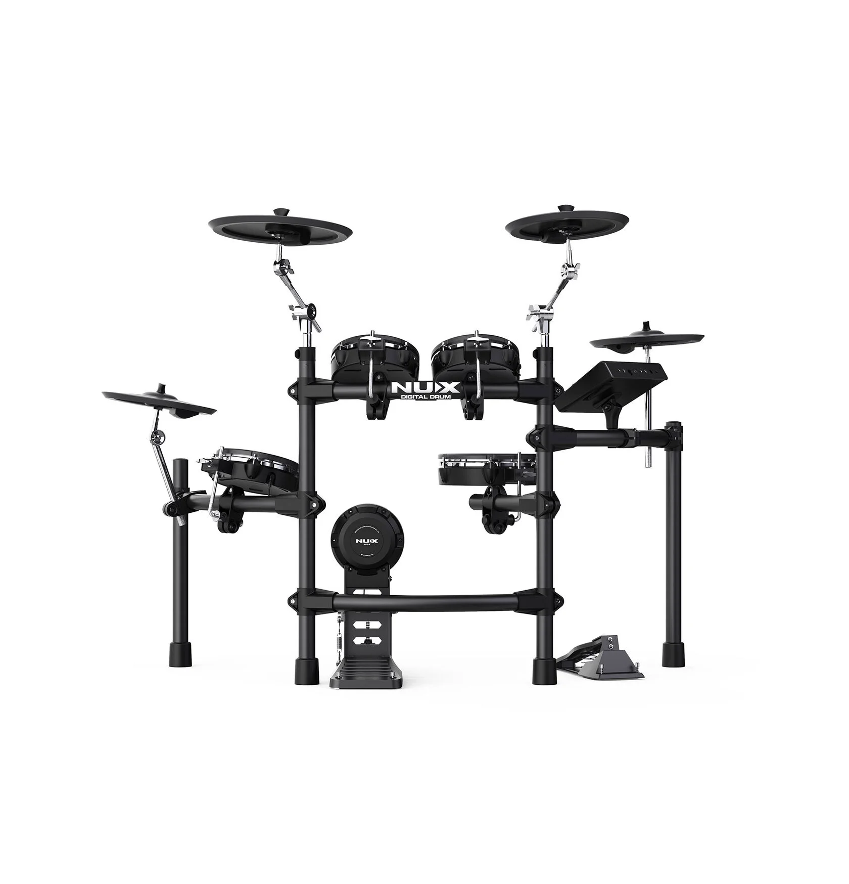 - · Комплектация: установка на раме, пэды, тарелки, пэд бас-барабана, педаль, стойка хай-хэта, модуль, кабели и питание