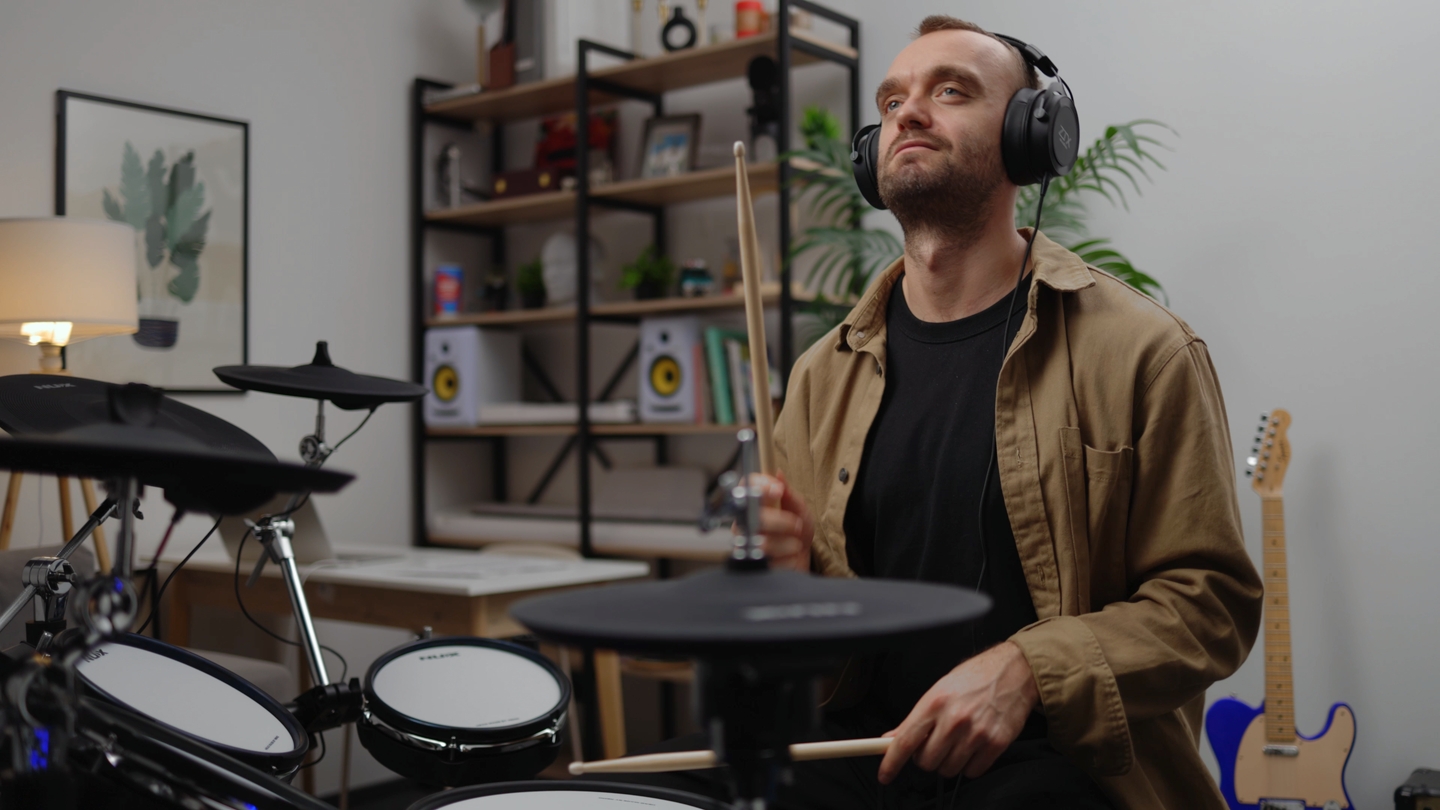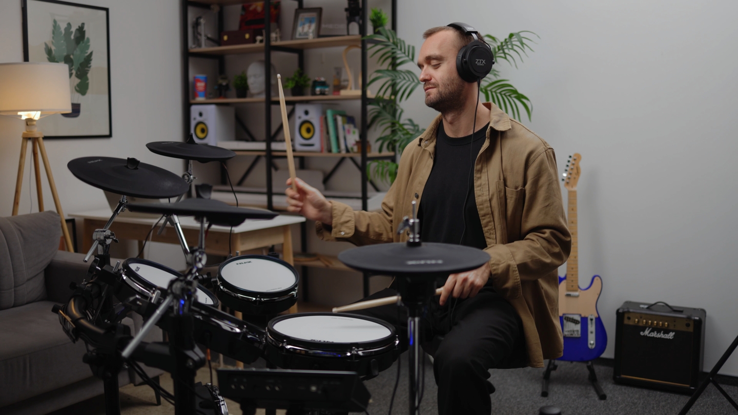 Проверяем звук на разных жанрах и динамике, чтобы услышать характер установки и её реакцию на игру. Тестируем хай-хет на быстрые нажатия, насколько плотно звучит бочка и как читается малый, плюс делаем замер шумомером для домашней реальности.