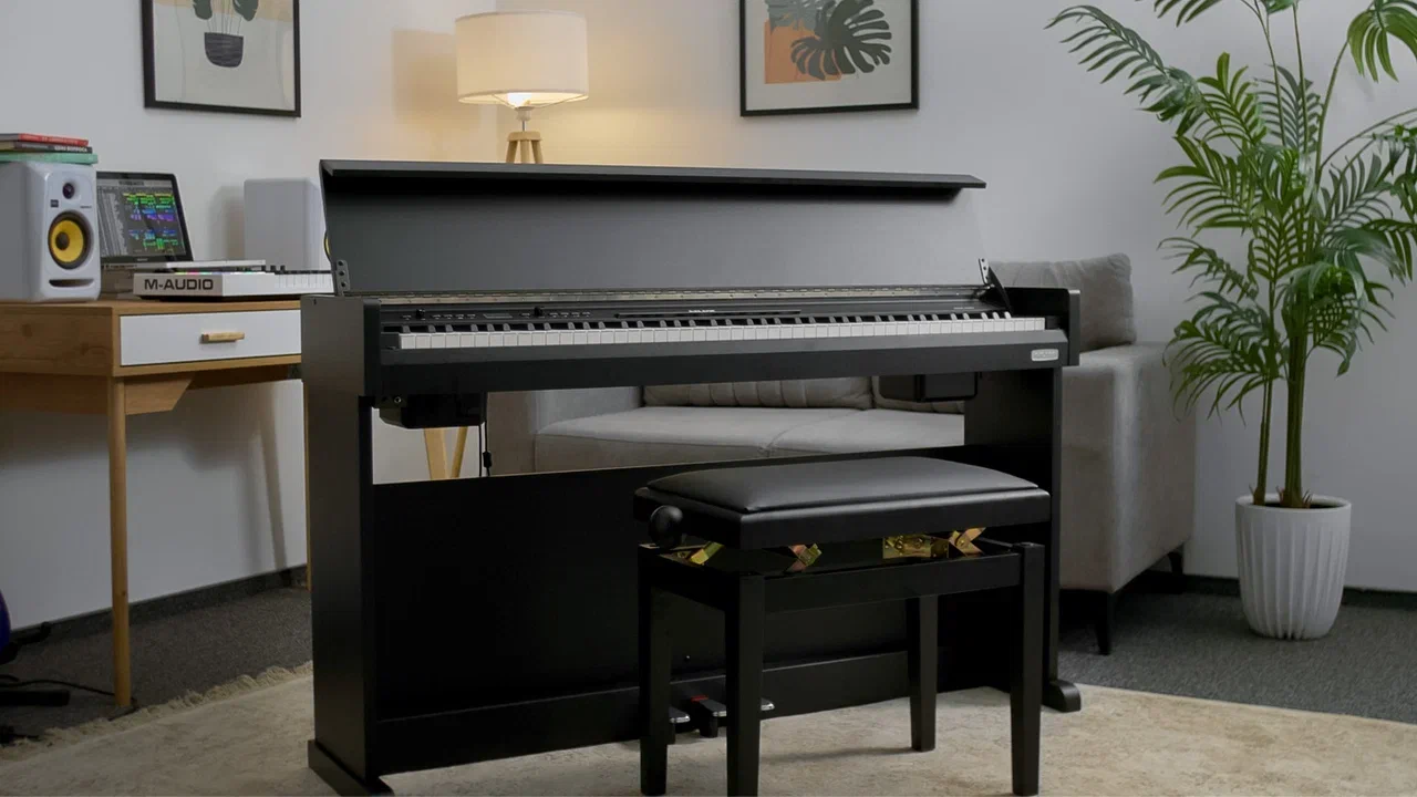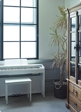 Нет, цифровое пианино не требует настройки, как акустическое. Вы просто включаете его в розетку, нажимаете кнопку ON — и инструмент работает. Звук не "плывет" и не зависит от температуры и влажности. -