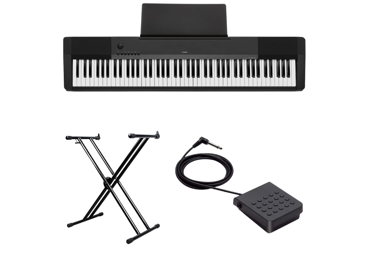 Корпус в строгом черном цвете, который спокойно вписывается в любую квартиру: детская, гостиная, кабинет или небольшая студия. Габариты 132,2 × 28,6 × 12,9 см и вес 11,4 кг делают инструмент достаточно лёгким, чтобы без труда переставлять его по комнате или взять на дачу. В комплекте уже идут стойка, пюпитр и педаль сустейна, так что не нужно отдельно покупать мебель и аксессуары. Получается аккуратное рабочее место для занятий, которое не захламляет пространство.