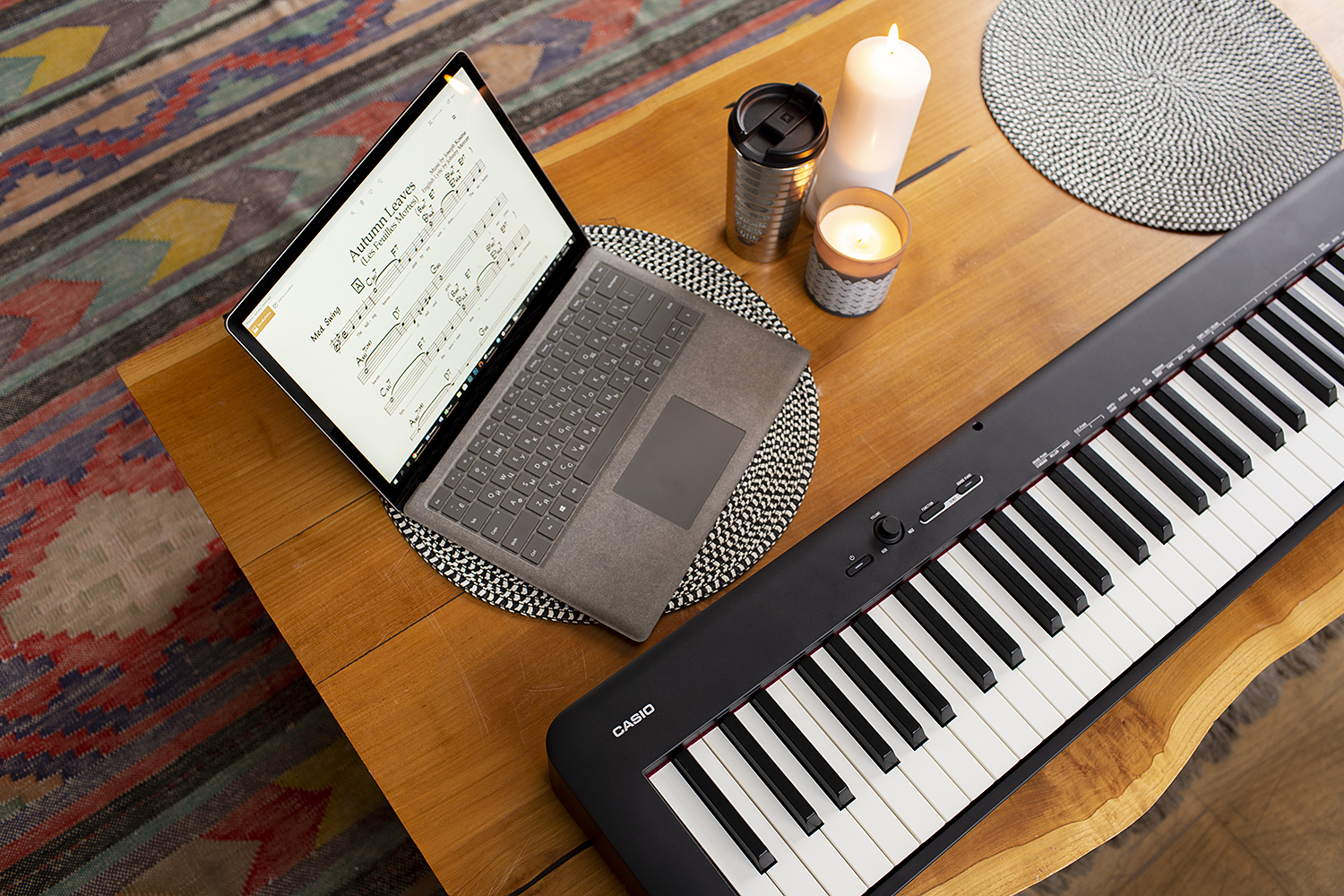Casio CDP-S100 BK в черном цвете выглядит аккуратно и современно, без лишнего блеска и нагромождений. Корпус очень тонкий: глубина всего 23,2 см и высота 9,9 см, длина 132,2 см при весе 10,5 кг. Инструмент легко переставить по квартире или отвезти в другое помещение, не устраивая переезд с грузчиками. В аренду мы даем пианино сразу с пюпитром, педалью сустейна и складной стойкой, которую можно быстро разложить для занятий и так же быстро убрать, если нужно освободить место.