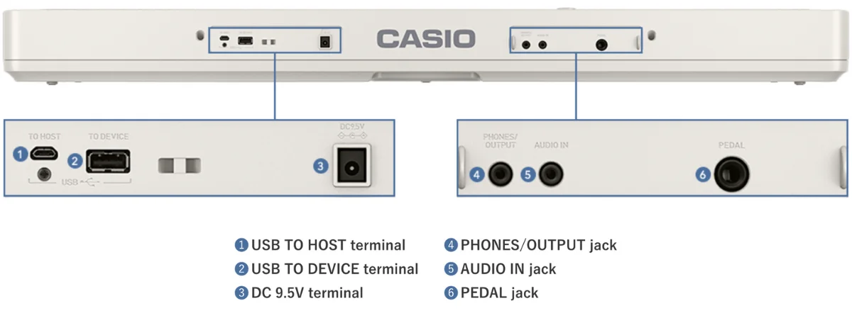 Есть выход для Bluetooth адаптера. Можно подключать пианино в качестве миди к компу, или к DAW станции, или ставить фоновые треки с телефона через встроенные колонки. Если лень покупать блютус адаптер, то есть Audio in. Все то же самое можно делать по старинке - через провода.
