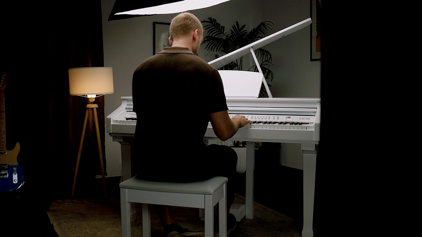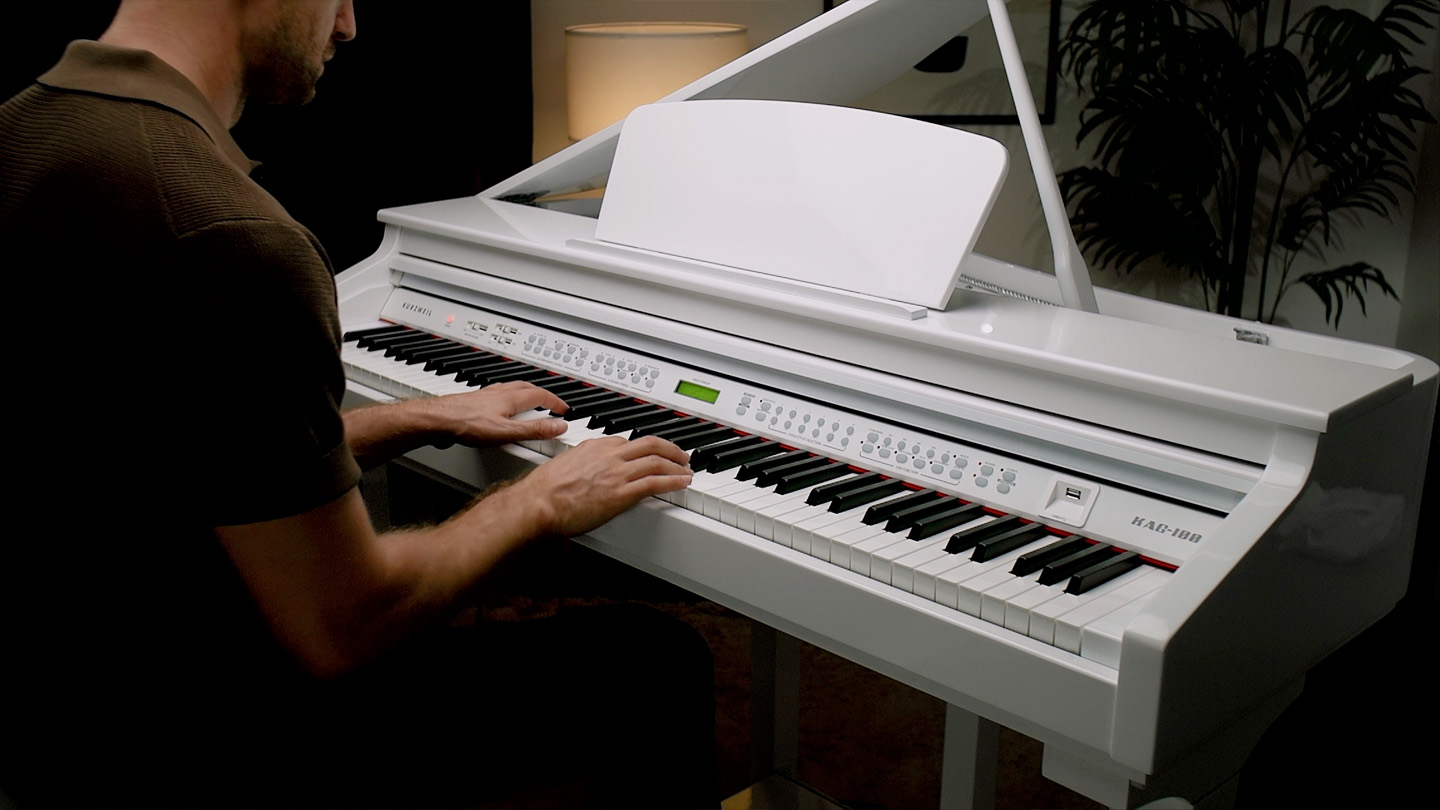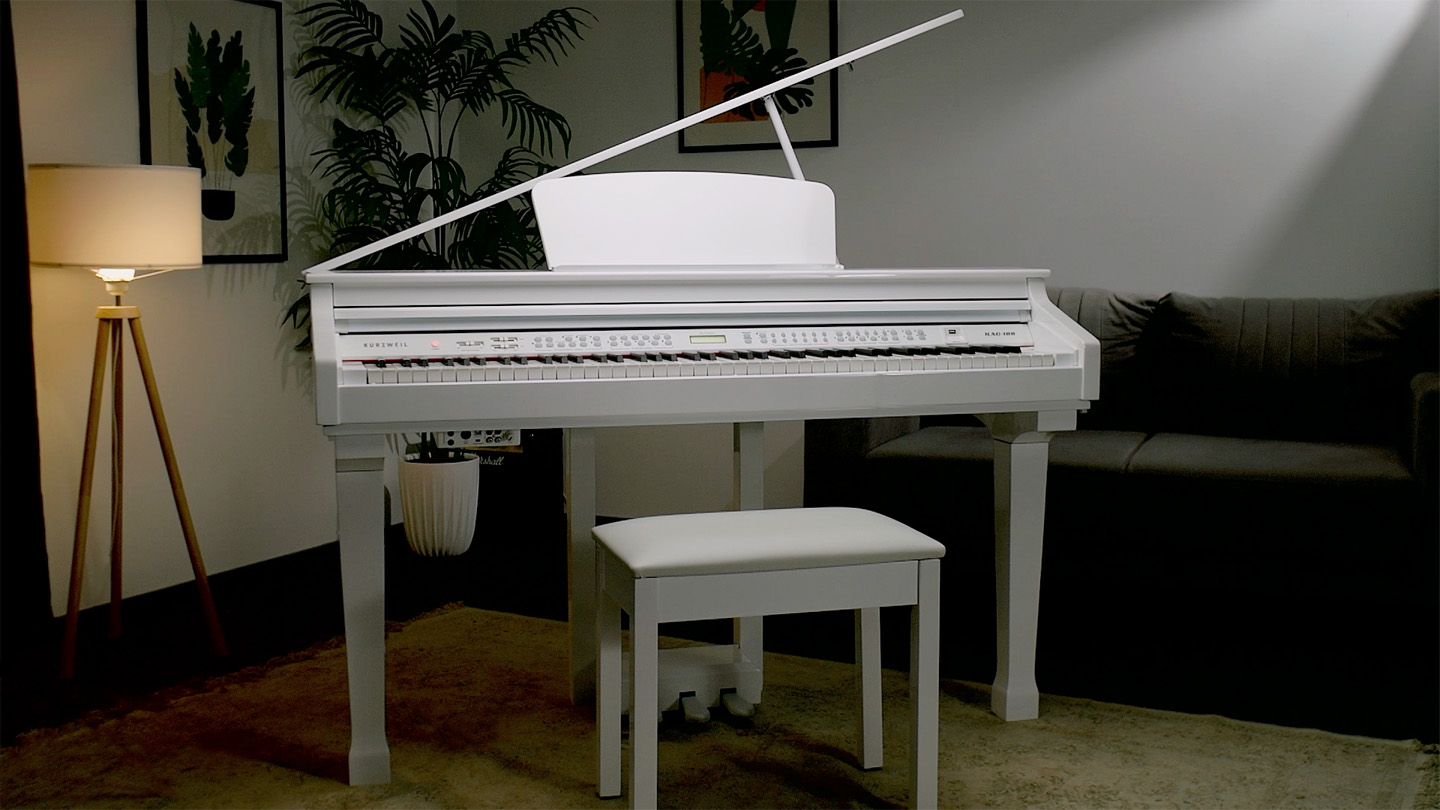 Показываем Kurzweil KAG100 в интерьере: форма корпуса под рояль, отделка и общий вид инструмента среди мебели.