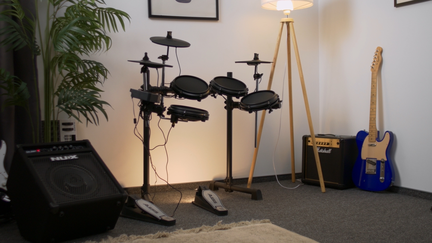Электронные барабаны для тех, кто хочет начать заниматься дома на тихой установке и не разориться на старте. В этом бюджете Alesis Turbo Mesh Kit даёт сетчатые пэды, компактный размер и достаточно вменяемый звук, чтобы не было ощущения "игрушки из супермаркета". Главная идея здесь — дать возможность спокойно вонзать палки в барабаны в квартире, отстроить базовую технику и понять, нравится ли вообще заниматься. Компромиссы есть: педали-контроллеры вместо кик-пэда и стойки хэта, простой модуль, но для первого комплекта это вполне честный расклад.